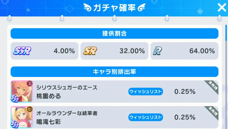 一般的なソシャゲの最高レア排出率3%よりも少し多めの4%。しかも未所持キャラを「ウィッシュリスト」に入れておくと、ピックアップされてさらに確率アップします。