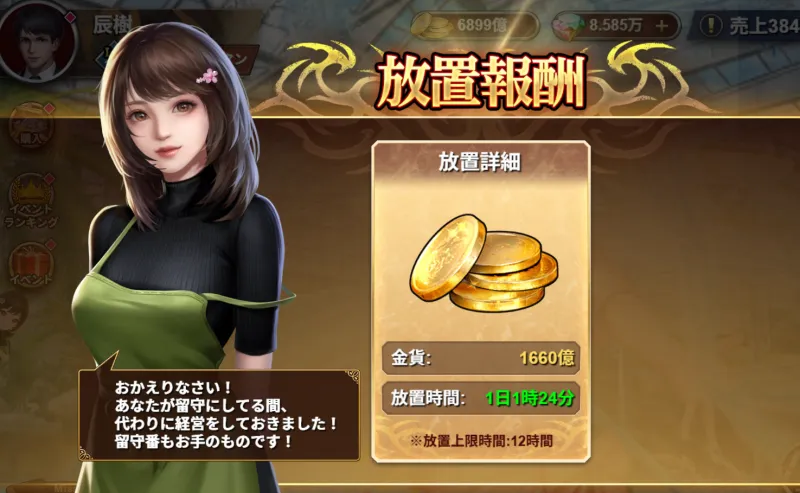 放置報酬上限が大きいので、毎日ログインできない人でもそれなりに楽しめるのがメリット。
