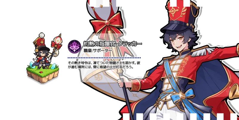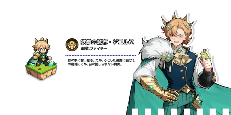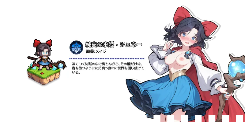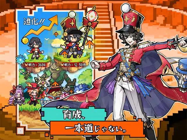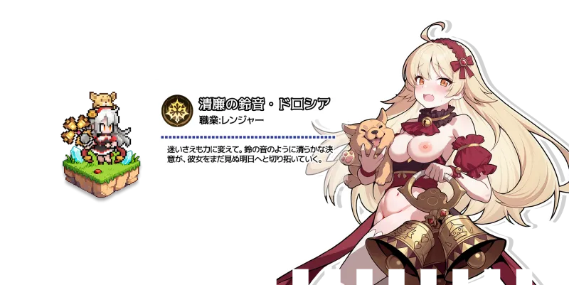 おとぎ話モチーフのファンタジー世界観で、ゲーム画面はドットイラストを採用しています。